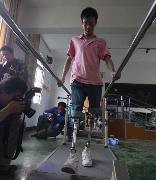5月8日,“夾縫男孩”鄭海洋在四川省北川中學(xué)康復(fù)站進行康復(fù)訓(xùn)練!皧A縫男孩”——北川中學(xué)高一學(xué)生鄭海洋在地震農(nóng)歷一周年5月2日重返校園,重新走入同學(xué)中間,開始新的生活。 在去年汶川大地震中,北川中學(xué)兩幢教學(xué)樓倒塌,正在高一·二班上課的鄭海洋與同桌廖波被同埋于水泥板下,22個小時后,鄭海洋獲救,付出的代價是他年輕健壯的雙腿。因與同桌廖波同埋于水泥板夾縫之中,被外界稱為“夾縫男孩”。將滿十八歲的鄭海洋,陽光、帥氣?措娨暋⒖磿、上網(wǎng)是他的板房生活常態(tài),他穿戴假肢練習(xí)行走進行康復(fù)訓(xùn)練,每次練習(xí)都要出一身大汗,F(xiàn)在的他已經(jīng)可以站立圍著板房區(qū)走一圈了。停學(xué)近一年的海洋進入了新的高一·一班。母親跟他住在一間宿舍照顧他。新老師、新同學(xué)們也樂于關(guān)心他,為方便進出專門安排他坐最后一排,下課時,同學(xué)們會推著他到外面轉(zhuǎn)轉(zhuǎn)。學(xué)校給予鄭海洋每月三百元的生活補助,并在宿舍安排和生活上盡可能給予照顧。海洋穿上假肢可以行走,目前的臨時校區(qū)處在山坡地,上下坡假肢用不上力,只能坐輪椅。他希望即將開工的新北川中學(xué)能夠為殘疾學(xué)生設(shè)立更便利的無障礙通道。中新社發(fā) 郭國權(quán) 攝