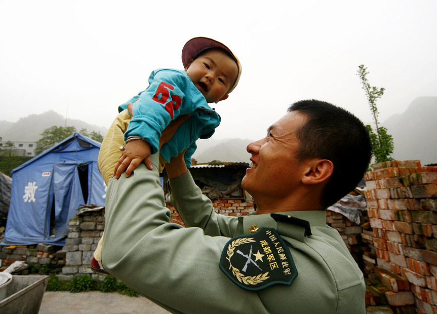 2009年4月下旬,解放軍官兵回到08年地震參加救援的重災區(qū)什邡市鎣華鎮(zhèn)、紅白真鎮(zhèn)、洛水鎮(zhèn),看望慰問當?shù)厝罕,祭奠遇難者。 中新社發(fā) 鐘 敏 攝