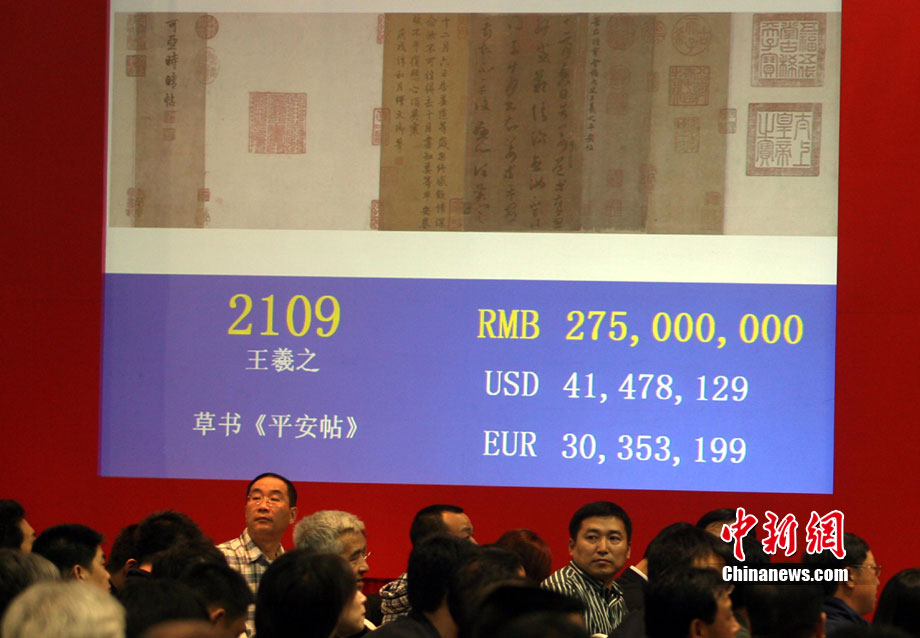 11月20日晚,在中國嘉德2010秋季拍賣會(huì)“秋光萬華——清代宮廷藝術(shù)集粹”專場(chǎng)中,王羲之草書《平安帖》以人民幣三億零八百萬成交。中新社 楊可佳 攝