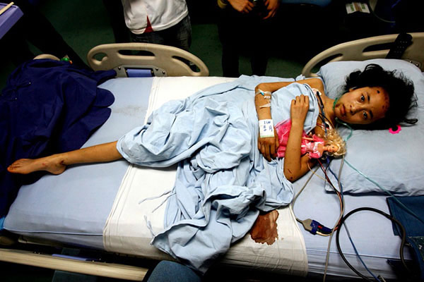 2008年5月18日,在四川省綿陽市第四十四醫(yī)院的重癥監(jiān)護(hù)室,11歲的李月在病床上。李月的理想是當(dāng)芭蕾舞蹈家,地震讓她失去了一條腿。 作者:郭鐵流 中國