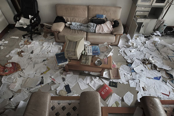 2008年10月14日,一位催討債務(wù)的男子在江龍集團(tuán)銷售辦公室睡覺。受全球金融海嘯影響,國內(nèi)最大的印染企業(yè)江龍集團(tuán)資金鏈斷裂,企業(yè)老板出逃,大批債權(quán)人來到集團(tuán)總部討債。作者:傅擁軍 中國