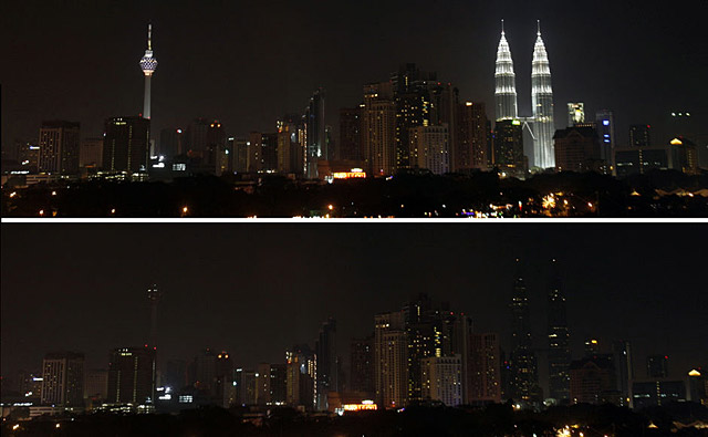 馬來西亞吉隆坡:3月28日,馬來西亞吉隆坡的吉隆坡塔(左)和雙子星塔(右)在參與“地球一小時(shí)”熄燈行動(dòng)前(上)和熄燈后(下)的對(duì)比情況。