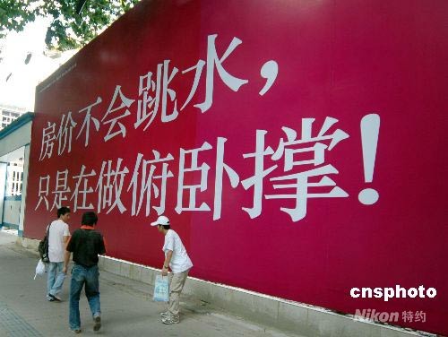 圖為房地產(chǎn)開發(fā)商在南京街頭打出的廣告牌。最近網(wǎng)絡上流行“我是出來做俯臥撐的”這句話,而南京某開放商也想借機炒作一把,在南京新街口附近立起一塊廣告牌“房價不會跳水,只是在做俯臥撐”。中新社發(fā) willis84 攝