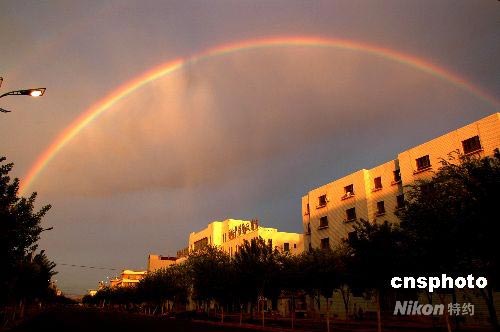 7月15日晚9時(shí)10分左右,新疆吐魯番市上空出現(xiàn)一道完整美麗彩虹,持續(xù)近10分鐘,街頭行人紛紛駐足觀看。中新社發(fā) 劉健 攝