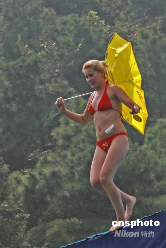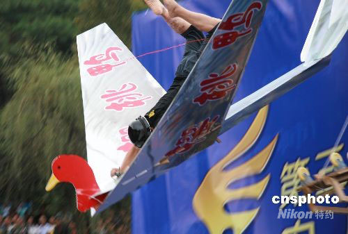 10月1日,第三屆全國鳥人飛行大賽在湖南長沙石燕湖景區(qū)舉行,三十余名“鳥人”在此展開角逐。鳥人飛行大賽純屬一項(xiàng)搞笑的娛樂運(yùn)動,參賽選手沒有任何限制條件,他們的飛行裝置千奇百怪,有抱著火炬“飛”的,有抓著飛機(jī)模型“飛”的,甚至有把雨傘當(dāng)飛行器的……中新社發(fā) 張家根 攝