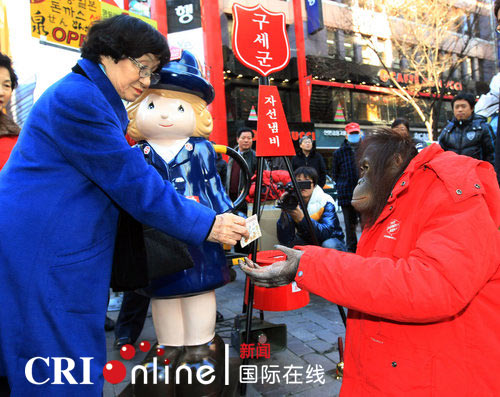 2008年12月15日,一只來(lái)自韓國(guó)高陽(yáng)一家動(dòng)物園的猩猩當(dāng)日現(xiàn)身首爾明洞街頭,為慈善組織“救世軍”募捐!熬仁儡姟北驹鲁蹰_始在韓國(guó)各大城市街頭接受社會(huì)捐贈(zèng)。