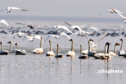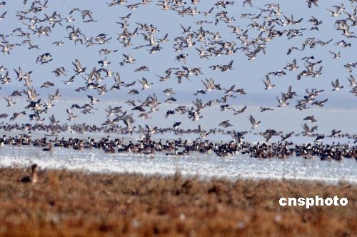 12月20日,大群雁類和鷸類候鳥在江西鄱陽湖星子縣沙湖山沙湖池上空飛翔。目前,中國第一大淡水湖江西鄱陽湖候鳥保護(hù)區(qū)八大湖池越冬棲息的珍禽候鳥總數(shù)已達(dá)30萬只,包括白鶴、白鸛等國家一級保護(hù)鳥類,以及雁類、鷸類、小天鵝、野鴨等珍禽候鳥。中新社發(fā) 段長征 攝