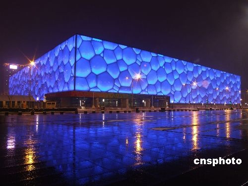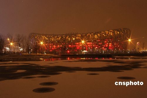 2月17日晚,北京市區(qū)內(nèi)時有雪意,雖未有大量積雪,但地面濕透的奧林匹克公園中心區(qū)夜景別具風情。中新社發(fā) 馮軍 攝
