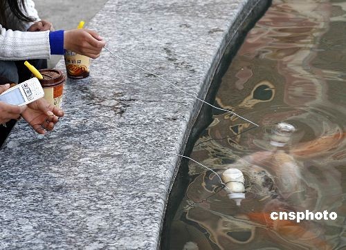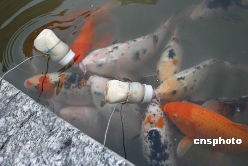 3月中旬,工作人員喂養(yǎng)“喝奶”的魚。在浙江東陽橫店影視城香港街景點(diǎn)內(nèi),養(yǎng)在水壇中的觀賞錦鯉是普通錦鯉與日本某錦鯉雜交后培育的品種,喂養(yǎng)它們則需要將飼料裝灌進(jìn)嬰幼兒奶瓶中,該飼料的顏色如“乳奶”一般,然后將奶瓶用鐵絲系住放入水中,隨后,這些魚兒就會圍攏過來,爭搶著用奶嘴吸“奶”喝了。