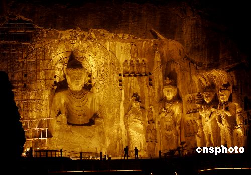 |   4月1日晚,洛陽(yáng)龍門石窟奉先寺亮化工程在進(jìn)行試燈調(diào)試。游人在4月7日后即可“夜游龍門”。當(dāng)晚,龍門石窟整體亮化工程全部2886個(gè)燈具、5370米燈帶同時(shí)接通點(diǎn)亮,延綿1公里的龍門西山2000個(gè)窟龕、10萬(wàn)尊石佛在現(xiàn)代燈光的輝映下首次在夜色中展現(xiàn)在人們面前。 經(jīng)國(guó)家文物局批準(zhǔn),洛陽(yáng)龍門石窟經(jīng)過(guò)3年的規(guī)劃、論證、設(shè)計(jì)和施工,投資800萬(wàn)元,對(duì)奉先寺等11個(gè)重點(diǎn)洞窟運(yùn)用各種現(xiàn)代照明形式,立體塑造夜間佛像表情生動(dòng)、造型各異的神采;對(duì)其它小洞窟進(jìn)行燈光修飾使其亮度輻射到整個(gè)山體,營(yíng)造出比日間自然景觀更具有古典藝術(shù)氣息和神秘色彩的別致氛圍,使中國(guó)的佛教文化在夜間大放異彩。中新社發(fā) 張曉理 攝