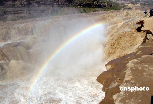 金秋十月,由于上游雨季影響水量倍增,長(zhǎng)長(zhǎng)的瀑布群沿黃河岸邊綿延一千多米,其中新增加的兩組大型瀑布寬度達(dá)到一百多米,頗為壯觀,加上艷陽(yáng)高照,壺口瀑布出現(xiàn)美麗的彩虹,讓游客流連忘返。中新社發(fā) 閆銳鵬 攝