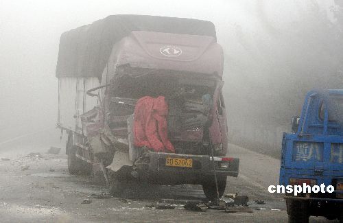 10月26日上午,罕見(jiàn)的秋季大霧彌漫河北省全景,高速公路全線封閉;寧晉縣附近狹窄的鄉(xiāng)間公路上兩輛貨運(yùn)卡車在能見(jiàn)度不足20米的惡劣條件下?tīng)?zhēng)道相撞,造成人員物資嚴(yán)重?fù)p失。每年秋末冬初,中國(guó)北方、特別是華北平原一帶經(jīng)常會(huì)出現(xiàn)大霧天氣。中新社發(fā) 任晨鳴 攝