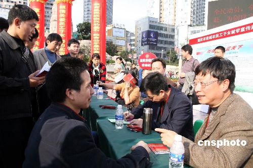 11月2日,重慶市教委為該市農(nóng)民工子女就學(xué)舉行大型咨詢活動,眾多當(dāng)?shù)剡M城務(wù)工人員前來咨詢學(xué)校招生、轉(zhuǎn)學(xué)等問題。據(jù)悉,此次咨詢活動是該市政府為迎接首個“重慶農(nóng)民工日”舉行的系列活動之一。中新社發(fā) 郭晉嘉 攝