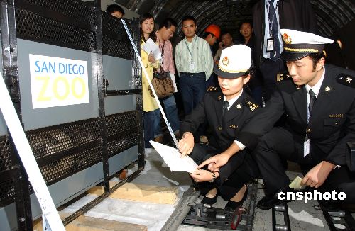 第一只在國(guó)外自然交配出生的大熊貓“美生”11月6日晚由美國(guó)飛抵上海浦東機(jī)場(chǎng)!懊郎钡竭_(dá)后,即被送往上海野生動(dòng)物園。這是上海海關(guān)第一次監(jiān)管過境的大熊貓,所以海關(guān)人員一直陪伴在“美生”身邊。11月7日,“美生”將回到其父母的出生地——四川臥龍定居。中新社發(fā) 殷琮 攝