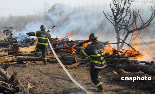 2007年11月10日,位于山西省盂縣一家廢舊木材回收站突然發(fā)生火災(zāi),盂縣消防大隊(duì)接警后迅速趕赴現(xiàn)場(chǎng)撲救,經(jīng)過近1個(gè)多小時(shí)的緊急撲救,終于將大火撲滅;馂(zāi)未造成人員傷亡,并成功防止了火勢(shì)向周圍民房和森林的蔓延。目前,火災(zāi)原因和損失正在調(diào)查之中。中新社發(fā) 程瑜 攝