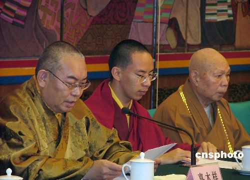 中國藏語系高級佛學(xué)院建院二十周年慶祝大會(huì)二十二日在北京人民大會(huì)堂西藏廳舉行,第十一世班禪額爾德尼·確吉杰布(中)出席慶祝大會(huì)。中新社發(fā) 徐長安 攝