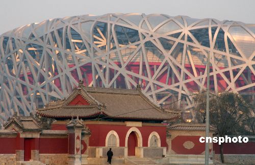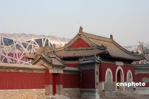 12月4日,北京奧運(yùn)會(huì)主會(huì)場(chǎng)“鳥(niǎo)巢”、國(guó)家游泳中心“水立方”與附近的中國(guó)古代建筑相映成趣,宏偉的國(guó)家體育場(chǎng)和明代的娘娘廟讓現(xiàn)代與傳統(tǒng)完美結(jié)合。中新社發(fā) 吳芒子 攝