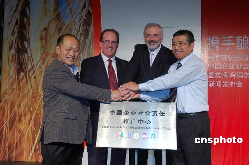12月5日,國家環(huán)?偩中讨行呐c英國英博啤酒集團共同為中國企業(yè)社會責任推廣中心揭牌,同時,英博集團正式向該中心遞交其《二00七年企業(yè)公民責任報告》,由此成為歸檔該中心的第一家外資企業(yè)。中新社發(fā) 潘旭臨 攝