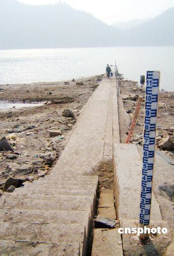 2007年12月7日,湖北宜昌江段裸露的江灘和水位標尺。目前長江已進入一年一度的枯水期,近期長江中游水位持續(xù)退落,比多年同期平均水位低近1.5米,根據(jù)當前枯水形勢及水位水情特征,長江航務(wù)管理局決定,長江中游實施二級橙色預警。對通過中游的船舶吃水深度進行規(guī)定,普通貨船實際吃水控制在2.4米及以下,危險品船舶實際吃水控制在2.3米及以下,下行船舶超過吃水限制的一律在宜昌港減載。中新社發(fā) 任衛(wèi)紅 攝