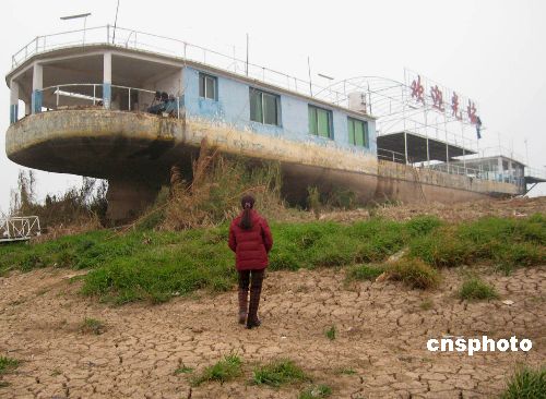12月10日清晨,湖南境內湘江流域長沙段面臨最低枯水位,游船高高擱淺在干涸的河床上。2007年汛期之后,湖南省降雨持續(xù)偏少,旱情迅速發(fā)展,已持續(xù)兩個多月,湘江水位持續(xù)走低,部分江段出現歷史記載以來的最低水位。據統(tǒng)計,目前湖南全省因旱造成4500多個村民組8.3萬多人及4萬多頭大牲畜飲水困難。中新社發(fā) 劉雙雙 攝
