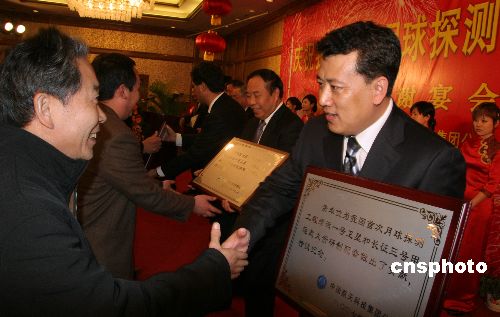 中國航天科技集團(tuán)公司兩位新任副總經(jīng)理袁家軍(中)、吳燕生(右)等向?yàn)樵摷瘓F(tuán)承擔(dān)首次月球探測(cè)工程研制任務(wù)提供幫助和支持的協(xié)作、配套單位授牌。