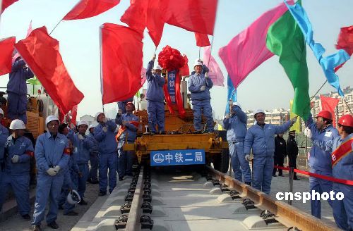 12月16日,備受關(guān)注的中國(guó)大陸首條高等級(jí)城際鐵路——京津城際快速鐵路鋪軌工程,繼12月10日北京區(qū)率先鋪通后,天津區(qū)亦宣告完成?偼顿Y133.24億元的京津城際快速鐵路工程,于2005年7月4日開(kāi)工,計(jì)劃2008年第一季度開(kāi)始綜合調(diào)試及試運(yùn)營(yíng),北京奧運(yùn)會(huì)開(kāi)幕前正式開(kāi)通運(yùn)營(yíng)。京津城際快速鐵路建成通車后,將實(shí)現(xiàn)京津兩地30分鐘內(nèi)通達(dá)。中新社發(fā) 段毅剛 攝