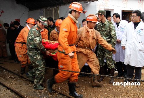 十二月十六日十三時五分,在地下被困一百一十四個小時后,安徽繁昌鐵礦事故六名受困礦工被成功救出。獲救的六名礦工被抬出礦井后,立即被等候在現(xiàn)場的救護(hù)車送到醫(yī)院急救中心,現(xiàn)在尚不能確定被救礦工是否脫離生命危險。目前還有一人下落不明,搜救工作仍在進(jìn)行。中新社發(fā) 水從澤 攝