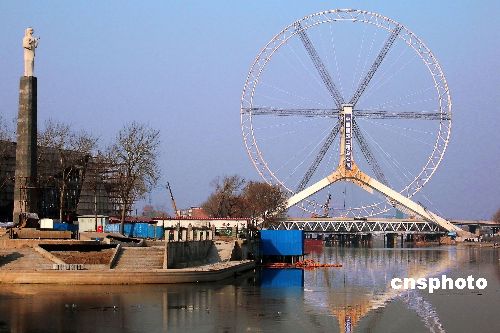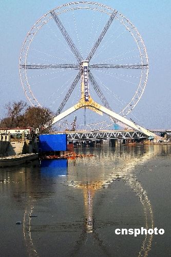 12月18日,位于天津三岔河口的重要景觀工程——“天津之眼”摩天輪輪盤安裝完畢,轉(zhuǎn)入負重測試和摩天輪座艙、電力驅(qū)動裝置安裝階段。“天津之眼” 摩天輪直徑110米,其最高點距離地面約120米。輪盤外掛48個透明座艙,可供384人同時觀光,是名副其實的“天津之眼”。 中新社發(fā) 田齊 攝