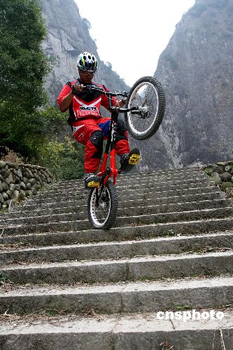 12月18日,創(chuàng)造了自行車攀登高樓吉尼斯世界新紀(jì)錄的“溫州小子”張金成,為即將舉行的“金茂巔峰對(duì)決 攜手共迎奧運(yùn)——2008金茂大廈國際自行車攀樓挑戰(zhàn)賽”進(jìn)行各式各樣的體能及技巧訓(xùn)練。此次挑戰(zhàn)張金成的是來自哥倫比亞運(yùn)動(dòng)員加維爾·薩帕塔、安道爾運(yùn)動(dòng)員夏維·卡薩斯,張金成對(duì)即將到來的“巔峰對(duì)決”感言:“目前最要緊的是心態(tài)要調(diào)整好,2008一定成功!”中新社發(fā) 陳昌其 攝