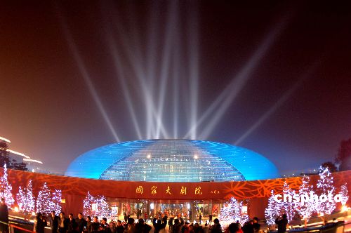 12月20日,北京國(guó)家大劇院測(cè)試首個(gè)演出季的外部燈光效果,藍(lán)色的燈光和背后高功率射燈將國(guó)家大劇院裝扮得夢(mèng)幻迷人。據(jù)悉,本次開(kāi)幕國(guó)際演出季將從2007年12月22日持續(xù)到2008年4月6日,期間將有78個(gè)劇目、180場(chǎng)精彩演出在這里隆重上演,其中三分之一為國(guó)外劇目,涵蓋了歌劇、舞劇、音樂(lè)會(huì)、話劇、民族戲曲五大藝術(shù)門類,預(yù)計(jì)接納觀眾30萬(wàn)人次。中新社發(fā) 廖攀 攝