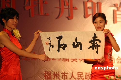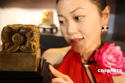 十二月二十日,北京奧組委在奧林匹克大家庭總部飯店北京飯店舉行壽山石奧運特許商品“中國牡丹印”首發(fā)儀式。歷史悠久、雕工精美的壽山石印,承載著“中國印·舞動的北京”與印鈕部分國色天香、雍容華貴的牡丹交相輝映。此次隆重推出的“牡丹印”是壽山石奧運文化精品系列的首批代表作,限量2008枚。該印采用中華國石之首壽山石與國花牡丹相結(jié)合,選材為“中華印石三寶”的壽山芙蓉石脈,可稱得上是精品中的精品。中新社發(fā) 任海霞 攝