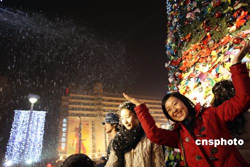 12月24日,北京西單街頭的一棵許愿樹前下起了“大雪”。這是商家為營造新年氣氛,利用造雪機給人們帶來的驚喜。不少年輕人一邊感受“雪天”的浪漫,一邊在貼紙上寫下祝福的話語掛在許愿樹上。中新社發(fā) 聞?wù)?攝
