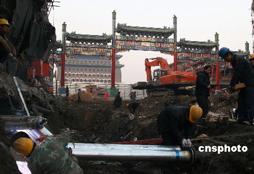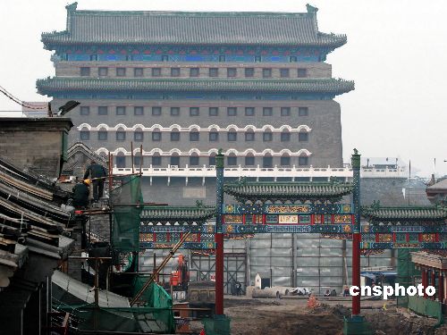 1月7日,北京前門步行街在寒冬中加緊施工。前門大街修繕整治后將恢復(fù)清末民初的建筑風(fēng)貌,成為傳統(tǒng)與現(xiàn)代相結(jié)合的步行街。位于前門大街正陽(yáng)門前的五牌樓已基本完工,亮出真容。中新社發(fā) 富田 攝