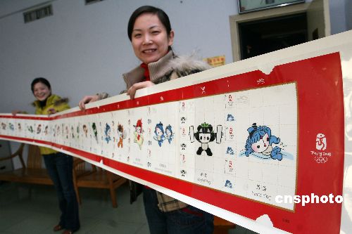 1月8日,河南省許昌市郵政局集郵公司的工作人員在展示《奧運(yùn)大長(zhǎng)卷》!秺W運(yùn)大長(zhǎng)卷》巨幅郵票是北京奧組委破例審批的超大規(guī)模奧運(yùn)珍品郵票,總長(zhǎng)達(dá)到6.33米。該郵票包含了北京奧運(yùn)會(huì)會(huì)徽、吉祥物、38個(gè)運(yùn)動(dòng)分項(xiàng)造型和北京奧運(yùn)口號(hào)等,有128枚連接在一起,單個(gè)項(xiàng)目福娃的規(guī)格是普通郵票的25倍,是史上規(guī)模最大和奧運(yùn)郵票最全的北京奧運(yùn)特種郵票長(zhǎng)卷。據(jù)悉,6.33米長(zhǎng)的《奧運(yùn)大長(zhǎng)卷》郵票比以往我國(guó)發(fā)行的《清明上河圖》郵票長(zhǎng)卷還要長(zhǎng)上1米多,其長(zhǎng)度和包含的郵票內(nèi)容都創(chuàng)造了奧運(yùn)郵票發(fā)行的新紀(jì)錄。中新社發(fā) 牛書(shū)培 攝