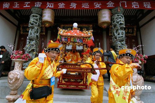 一月八日,福州市晉安閩臺(tái)王審知研究會(huì)在福州蓮花山閩王紀(jì)念館舉行儀式,歡送閩王金身首次巡安金門。九日上午,閩王金身將經(jīng)廈金航線直航金門,進(jìn)行為期四天的巡安活動(dòng)。中新社發(fā) 王東明 攝
