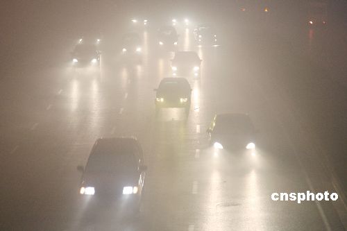 1月9日,汽車在霧中緩慢行駛。當日,南京出現(xiàn)大霧天氣,局部路段能見度小于50米,給城市交通和市民出行帶來不便,當?shù)貧庀蟛块T先后發(fā)布大霧橙色預警信號和大霧紅色預警信號,提醒市民不要進行戶外活動。中新社發(fā) 鐘山 攝
