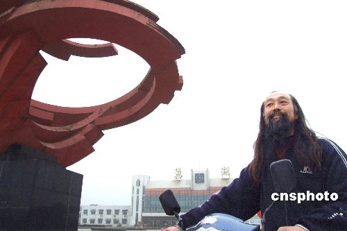 1月10日,創(chuàng)兩項吉尼斯世界紀(jì)錄——“殘疾人騎自行車穿越羅布泊之最”和“殘疾人騎自行車游中國之最”的殘疾人劉郁寶單車來到安徽巢湖市。他已行經(jīng)全國近千座城市,行程六萬公里。他此次來巢湖的目的是,宣傳祖國和平統(tǒng)一 ,呼吁全社會關(guān)心和支持殘疾人事業(yè),并為建立“中華史料庫”搜集史料。中新社發(fā) 張發(fā)平 攝
