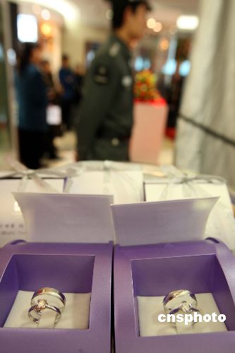 一月十一日,“相印五環(huán) 百年華嫁”奧運特許商品結(jié)婚鉆飾新品在北京上市。這是第一款奧運婚慶主題概念的鉆石類奧運特許商品,突破了貴金屬特許商品市場只有收藏性紀念品的局限,創(chuàng)新性填補了市場空白。中新社發(fā) 任海霞 攝