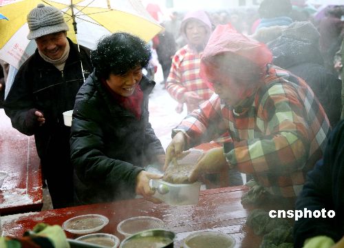 1月15日,南京市民排隊領(lǐng)取毗盧寺派送的臘八粥。當(dāng)日是中國傳統(tǒng)的“臘八節(jié)”,民間有喝臘八粥的習(xí)俗,南京名剎毗盧寺免費向市民提供28888份臘八粥,吸引了眾多市民排長隊領(lǐng)取。據(jù)了解,毗盧寺當(dāng)天免費提供的臘八粥,是由紅豆、花生米等38種原料用微火熬制而成,其中僅糯米就有2888斤。中新社發(fā) 鐘山 攝