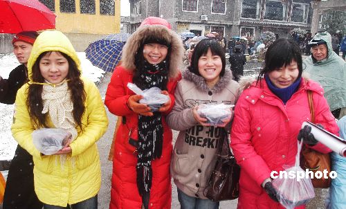 1月15日上午9時(shí),江蘇揚(yáng)州大明寺臘八節(jié)放粥送福發(fā)放處,近千市民冒雪排長隊(duì)領(lǐng)取免費(fèi)臘八粥和“!弊。當(dāng)日清晨5時(shí),該寺廟開始放粥送;顒(dòng)。中新社發(fā) 范友林 攝
