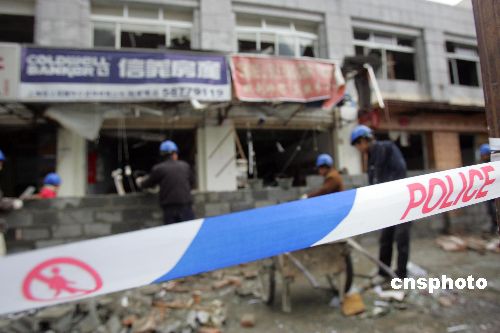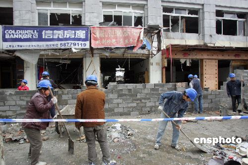 圖為工人在清掃爆炸事故現(xiàn)場。