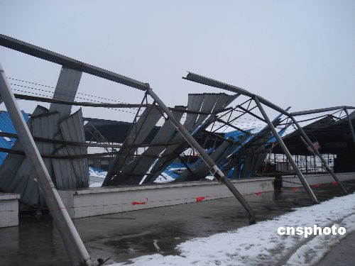 2008年1月20日凌晨,由于連日的暴雪,導(dǎo)致安徽省合肥市包河苑農(nóng)貿(mào)市場(chǎng)上千平方米蔬菜大棚被雪壓塌。由于連降暴雪,安徽合肥等地,不少工廠倉(cāng)庫(kù)和農(nóng)貿(mào)市場(chǎng)的簡(jiǎn)易大棚被雪壓塌,目前沒(méi)有造成人員傷亡。中新社發(fā) 何保豐 攝