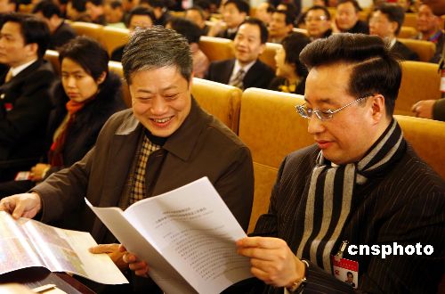 發(fā)表評論 一月二十三日,政協(xié)上海市第十一屆一次會議開幕,香港房地產(chǎn)企業(yè)家屠海鳴(右)與上海恒源祥董事長劉瑞旗出席會議時進(jìn)行交談。他們表示,將對上海的地產(chǎn)、交通、金融和文化等方面提出各自的建議。中新社發(fā) 潘索菲 攝