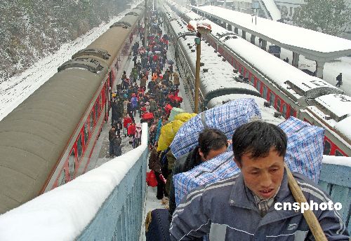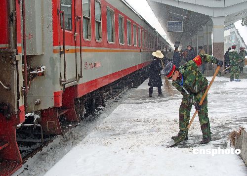 2008年1月27日,湖北宜昌再次普降大雪,宜昌市火車站積極迎戰(zhàn)大雪保鐵路春運安全,讓旅客旅途平安。中新社發(fā) 劉君鳳 攝