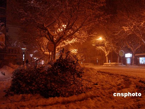 1月28日凌晨,江蘇南京漢中門大街路旁,部分樹枝不堪重負(fù),被厚重的積雪壓斷。連日持續(xù)的暴雪襲擊江蘇,積雪已達(dá)20多厘米。據(jù)氣象部門發(fā)布,這是近10年來江蘇罕見的連續(xù)性大面積強(qiáng)雨雪天氣。中新社發(fā) 胡高華 攝