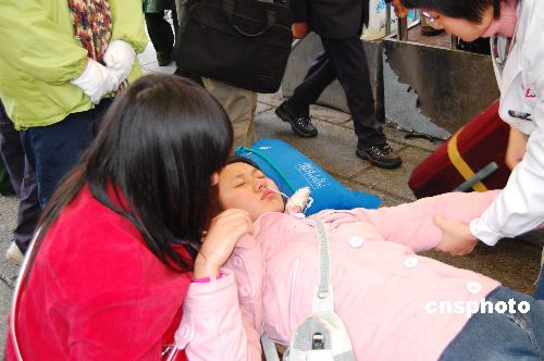京廣鐵路湖南段從25日起出現(xiàn)大面積旅客列車晚點,到28日仍未恢復(fù)正常秩序,仍有七萬多名旅客被迫滯留在廣州火車站。由于長時間候車,有的旅客在現(xiàn)場暈倒,醫(yī)護(hù)人員進(jìn)行了緊急救治。中新社發(fā) 柯小軍 攝