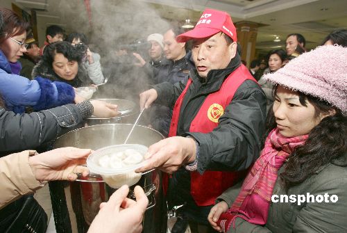 近期由于受大雪天氣影響導(dǎo)致國(guó)內(nèi)大范圍的鐵路、公路交通受阻或中斷,使大批返鄉(xiāng)旅客滯留杭州火車站、杭州火車東站和市區(qū)各大長(zhǎng)途汽車站,從1月27日起,杭州市開(kāi)辟了部分劇院、大廈、會(huì)展中心、體育館等公共場(chǎng)所及搭建軍用帳篷等作為滯留旅客的臨時(shí)駐留點(diǎn)。至1月30日下午,已先后接待了近10萬(wàn)人次的滯留旅客,當(dāng)?shù)氐恼块T、企事業(yè)單位、部隊(duì)、公安、街道、衛(wèi)生、共青團(tuán)、市民志愿者等紛紛行動(dòng)起來(lái),按照“有水喝、有飯吃、有地方安頓、生病有醫(yī)治、困難群眾有救助”的要求,以各種形式盡力為所有滯留旅客提供生活保障和溫馨服務(wù)。 中新社發(fā) 李忠 攝