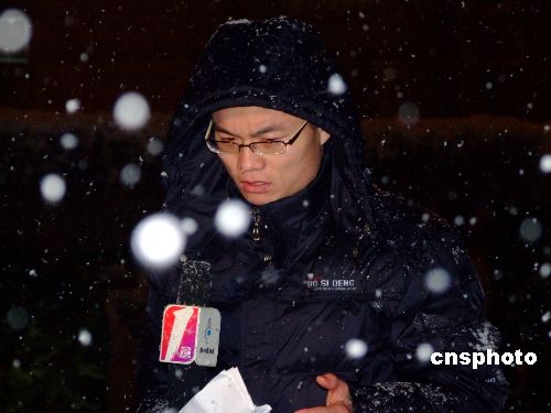2月1日晚11點(diǎn),浙江電視臺記者冒著大雪在杭州火車站現(xiàn)場采訪。連日來,杭州持續(xù)低溫、強(qiáng)降雪,導(dǎo)致旅客大量滯留。中新社發(fā) 邱柏星 攝