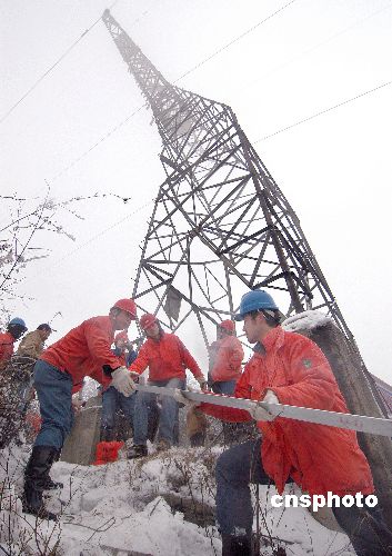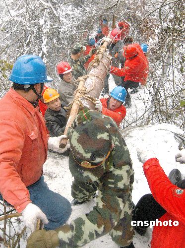 春節(jié)前夕,湖北省黃石市武警支隊160多名干部戰(zhàn)士與黃石供電公司近千名員工冒雪轉(zhuǎn)運(yùn)鐵塔架。元月29日下午,位于黃石市黃荊山海拔400多米的黃石電廠至西塞山區(qū)石板路的22萬伏高壓線路突然斷電,黃石供電公司迅速組織職工查找故障,巡線工人在黃思灣林場附近的一處山頭,發(fā)現(xiàn)該線路19、20、21號鐵塔嚴(yán)重彎曲,導(dǎo)線已經(jīng)與鐵塔接地。其中20號鐵塔傾斜達(dá)30度,徹底失去供電能力,受損極其嚴(yán)重。由于受損鐵塔位于較高的山頂,山上積雪達(dá)50厘米,施工環(huán)境十分惡劣,黃石供電公司組織的技術(shù)人員通過現(xiàn)場實地調(diào)研后決定,對兩座傾斜鐵塔進(jìn)行更換,市武警支隊與搶修人員正全力以赴運(yùn)送15噸的搶修物資上山。中新社發(fā) 邱孝威 攝