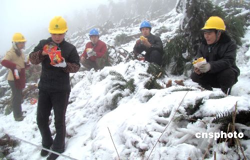 2月3日,電力工人在搶修110KV線路。1月17日以來,四川瀘州敘永遭遇百年不遇的雨雪冰凍災害,導致11萬千伏倒桿斷線2KM,10千伏斷線426KM,380伏斷線937KM,高壓倒桿142余根,低壓倒桿485余根,變壓器約25臺受損。為盡快搶通線路,電力工人們風餐露宿、加班加點。 中新社發(fā) 黃虎 攝
